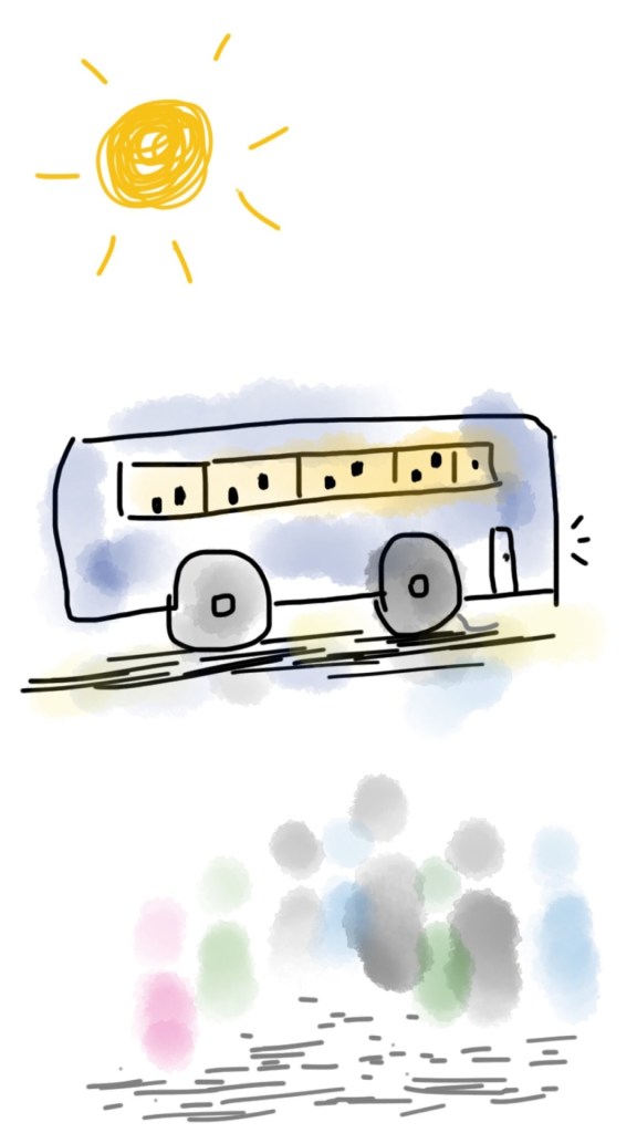 Oh no. The horror of it stopping and going were running in my head as it edged to the stop sign with me behind it. I have to go right, I madly thought while staring at the bus. The bus didn’t have its blinker on! Hope! It must be going straight! And then, slowly, the red blinker of the bus showed that it too would be heading to the right. Doomed.